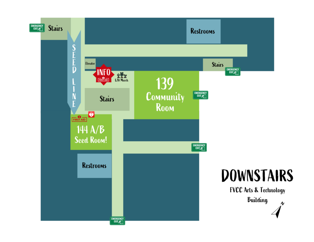 - If you need help grabbing a seed bundle, getting to or from the Seed Rooms, or getting situated in a workshop classroom, please come to the Upstairs Information Table (as you enter the building) and let us know.