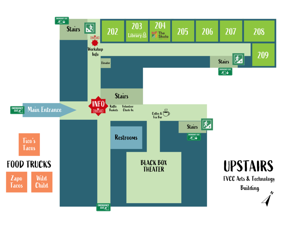 - Where: Upstairs in the northwest wing – rooms 202 – 208, as well as the Black Box Theater. Please refer to the Building Map at the bottom of this page. Click the arrows to see different maps.